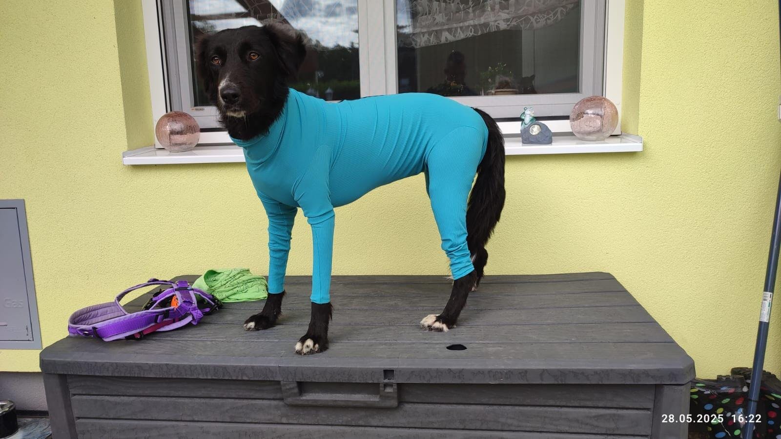 Afra hat sich super erholt. Mittlerweile spaziert sie wieder durch die Gegend. Die beiden Bodys haben sehr geholfen!